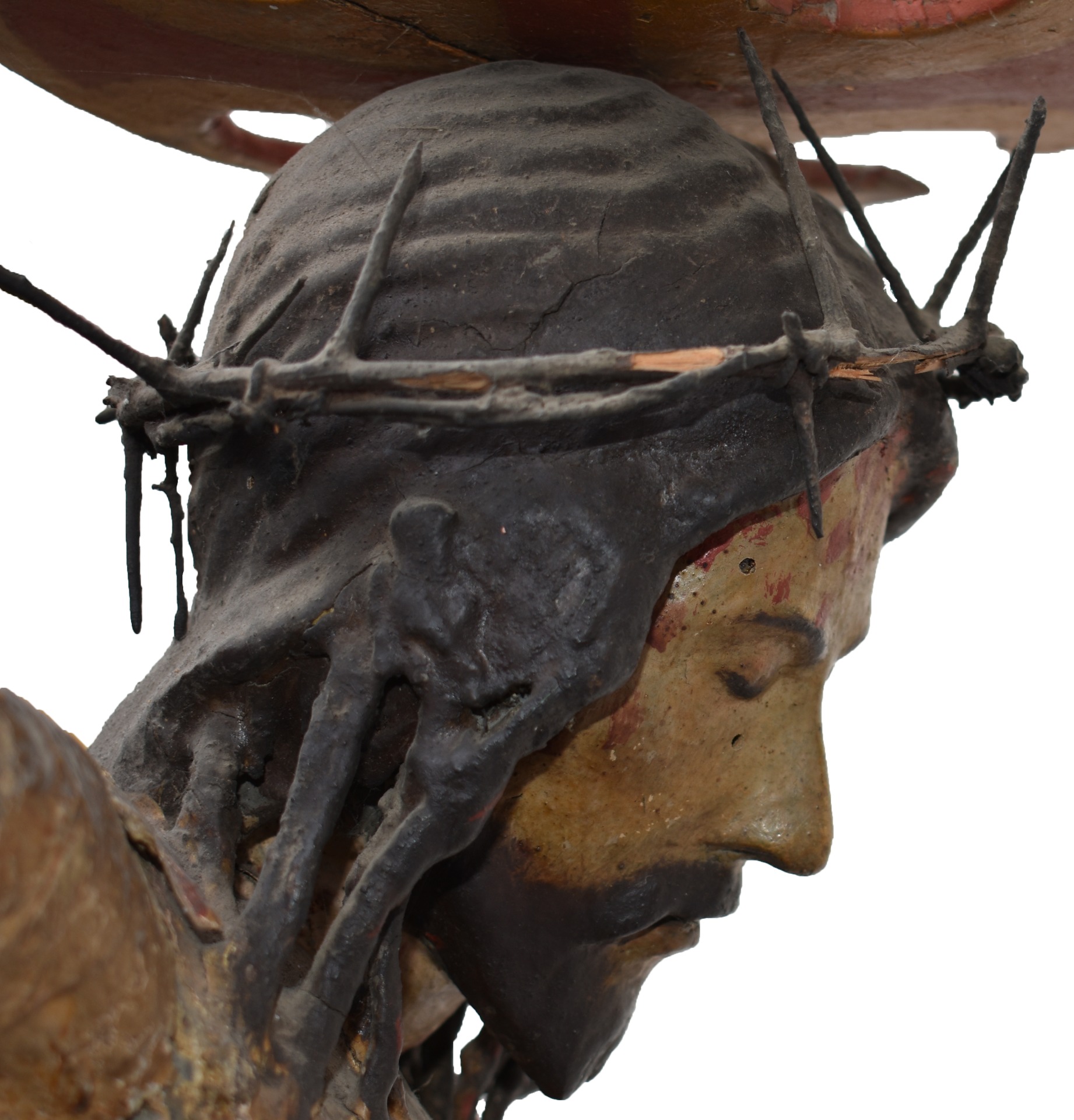 finali delle ciocche di capelli e della corona di spine.Le gambe sotto le ginocchia presentano fessurazioni trasversali dovute alla